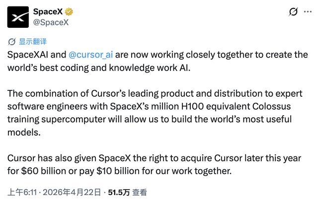 SpaceX在X平台发帖晓喻这一来回,称两家公司"正喜悦配合,共同打造大家最强编程及学问使命AI"。